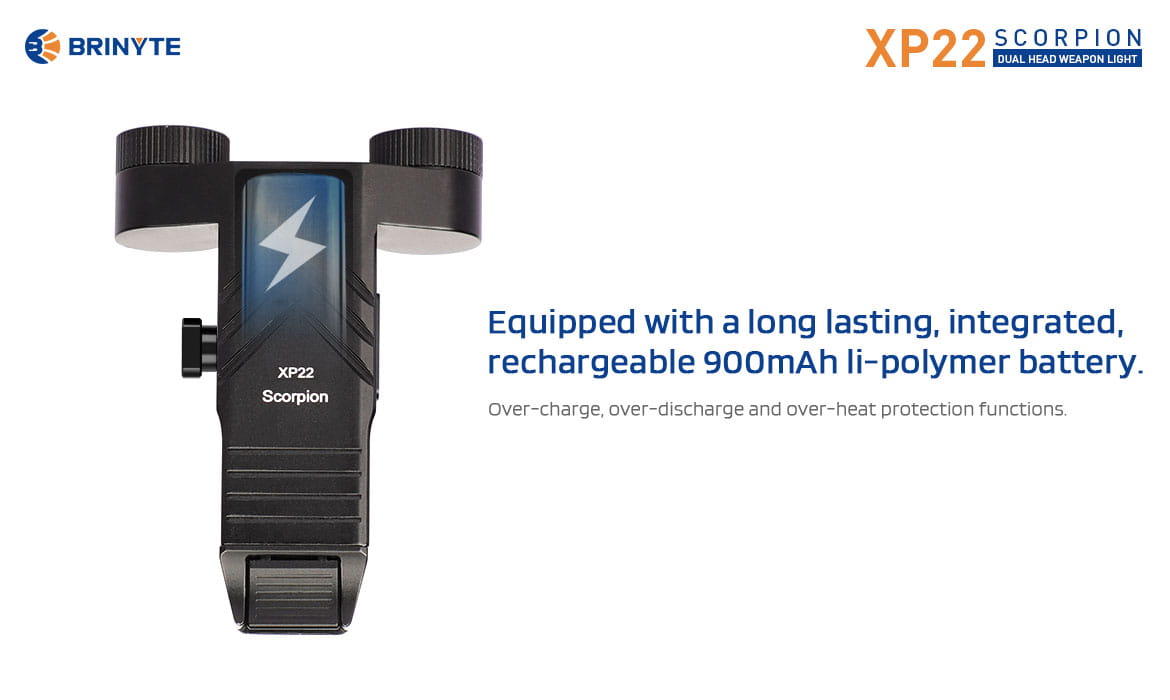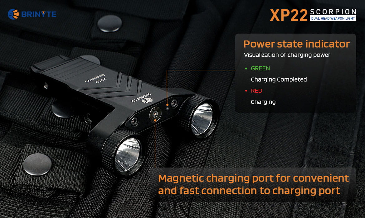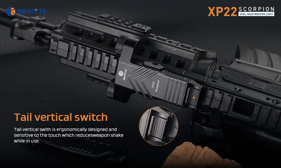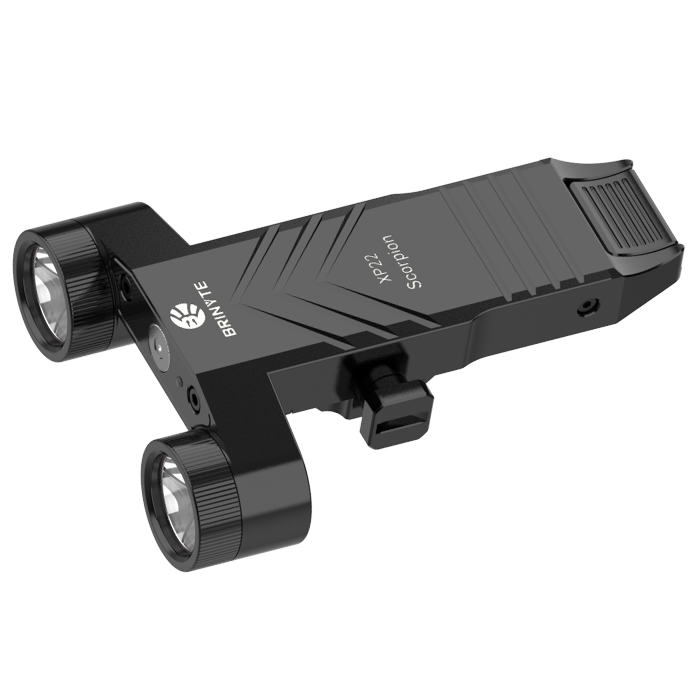 BRINYTE XP22 to wydajna, łatwa w obsłudze dwugłowicowa latarka pistoletowa o mocy 1300 lumenów, odpowiednia do różnych zadań.