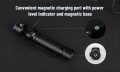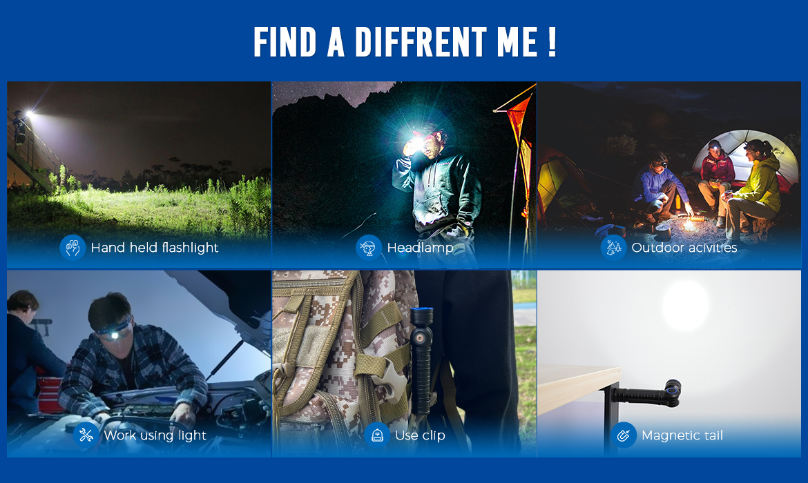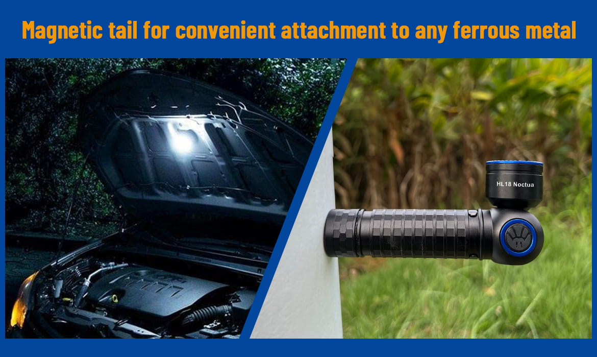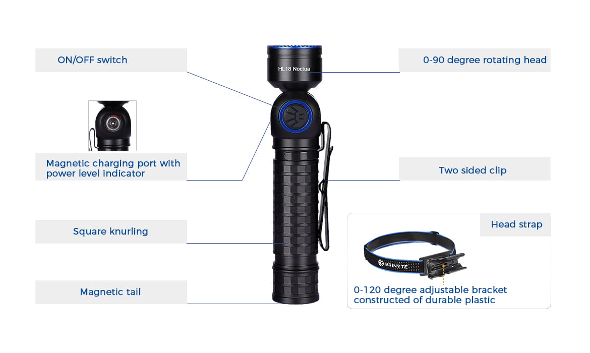 Zasilany jedną baterią 18650 3100 mAh, działa do 120 godzin przy 10 lumenach. Dzięki obrotowej głowicy o 90 stopni, regulowanemu wspornikowi w zakresie 0-120 stopni wykonanemu z wytrzymałego tworzywa sztucznego i mocnej podstawie magnetycznej, ta mała latarka czołowa może doskonale spełniać większość potrzeb oświetleniowych.