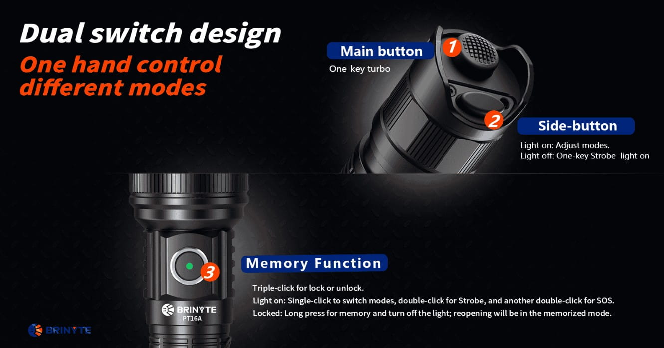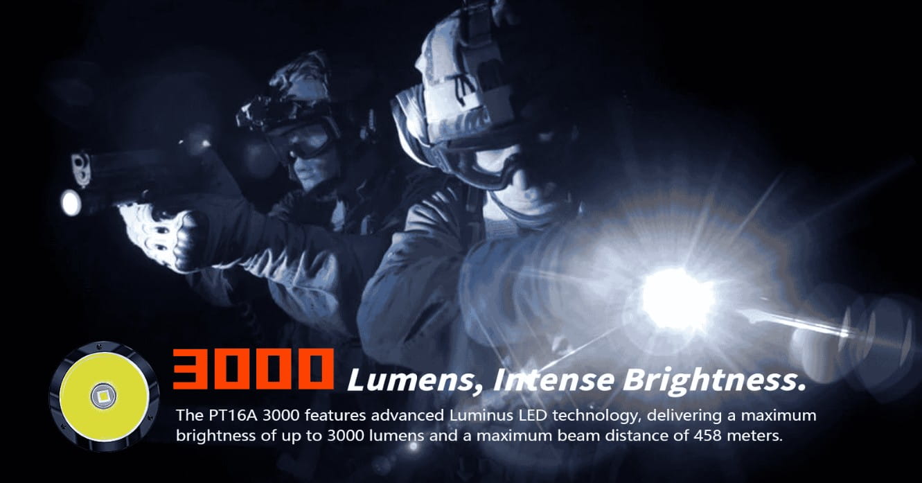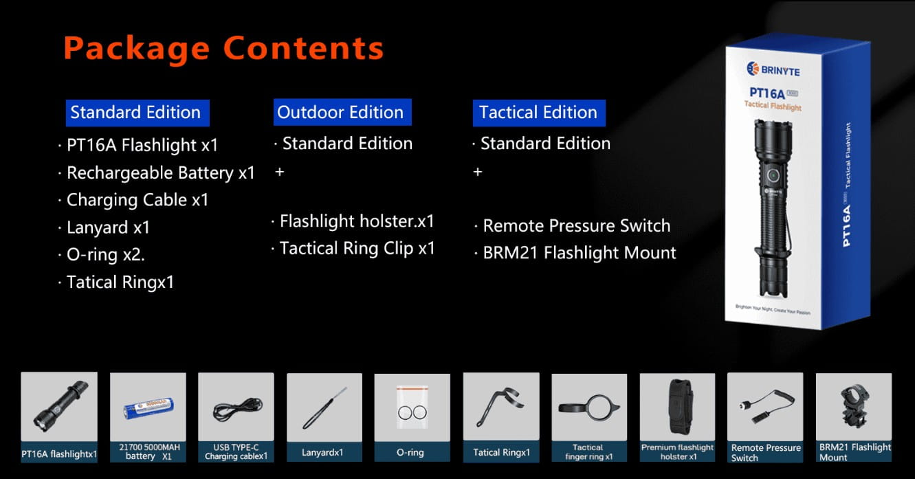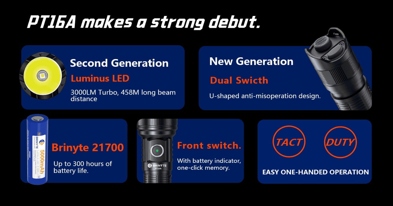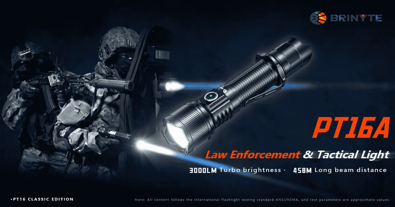 Brinyte PT16A 3000 to ulepszona taktyczna latarka akumulatorowa. Wykorzystuje diodę Luminus LED o maksymalnej wiązce 3000 + lumenów. Intensywność wiązki sięga 52 500 kandeli, a zasięg może sięgać ponad 458 metrów. W zestawie znajduje się akumulator litowo-jonowy Brinyte 21700 z interfejsem USB TYPE-C. Przełącznik tylny i przycisk przedni ułatwiają obsługę.