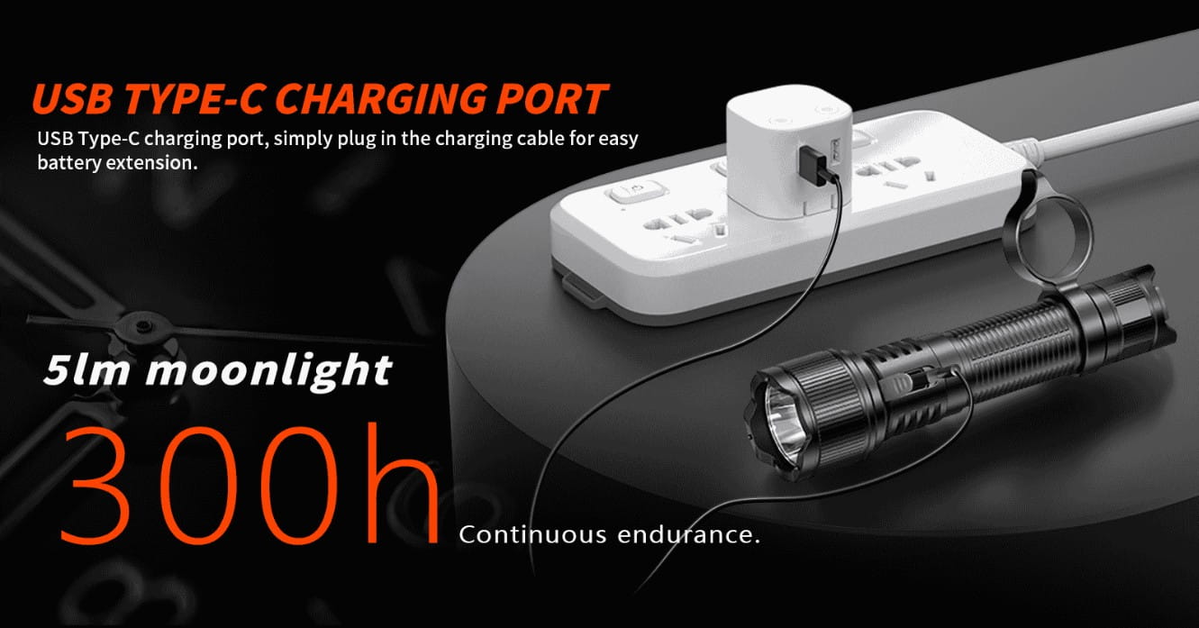 Latarka, Akumulator 21700; Kabel ładujący USB typ C; Smycz na klucze; Zapasowy O-ring; Spinacz