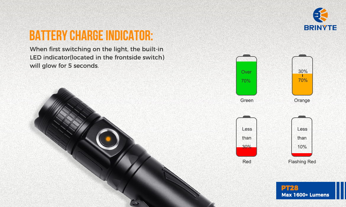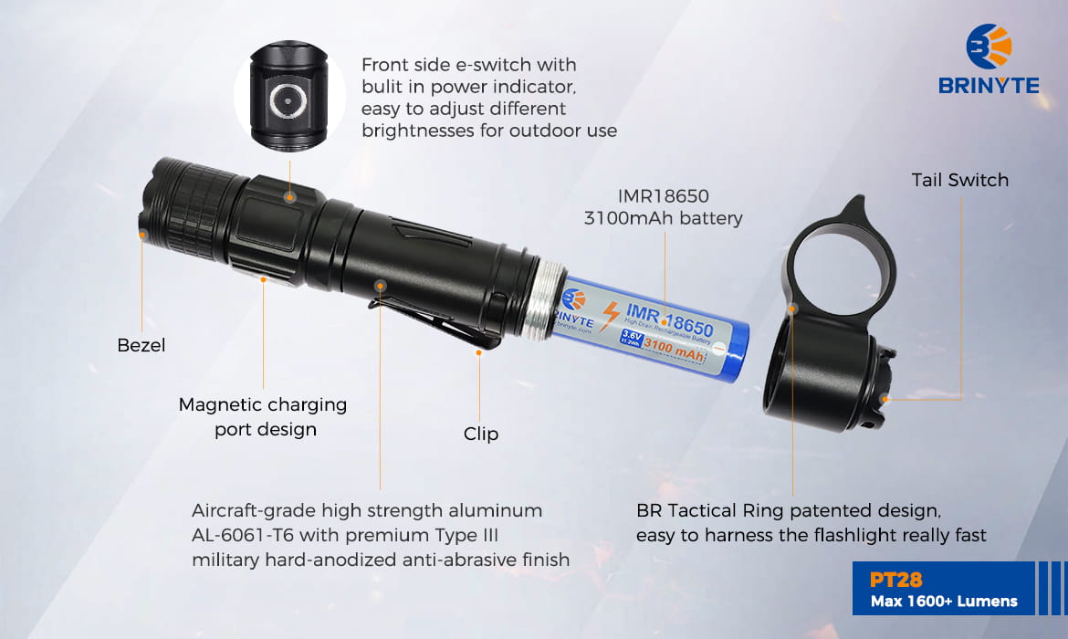 Wyposażona w akumulator litowo-jonowy Brinyte 18650 3100mAh, latarka taktyczna PT28 gwarantuje długotrwałą moc, redukując potrzebę częstej wymiany baterii.