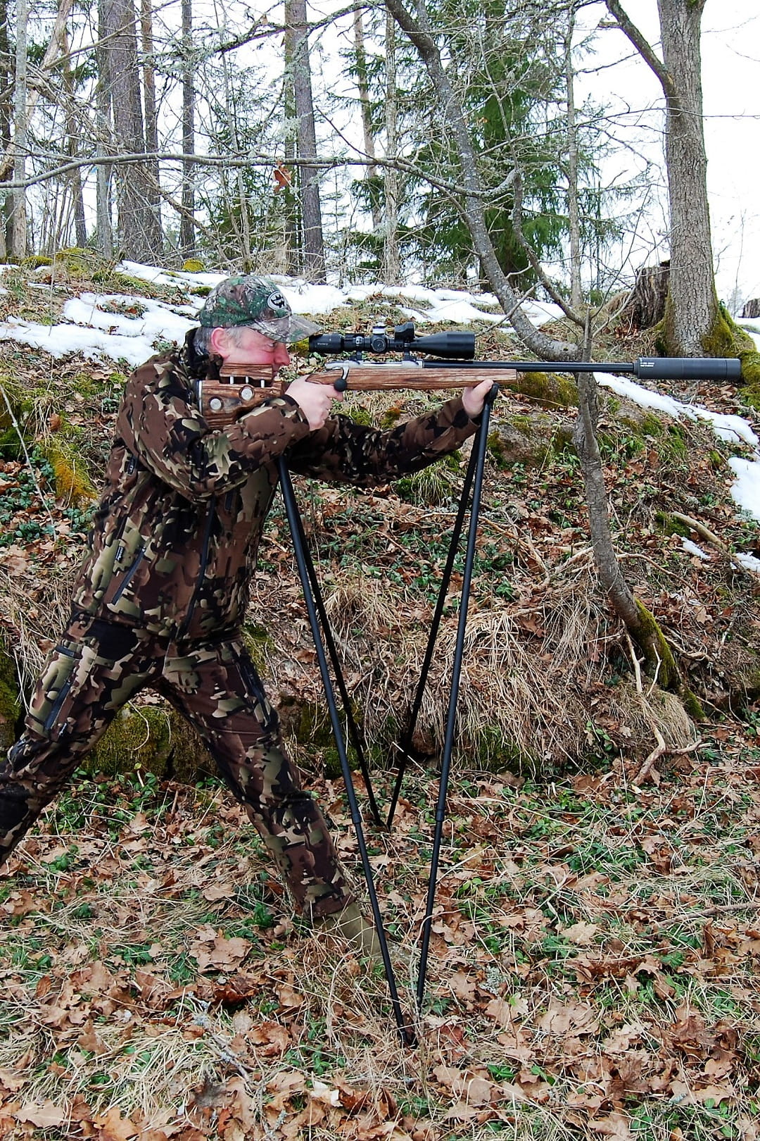 W obu górnych sekcjach wbudowana jest przekładnia, która zapewnia, że zawsze znajdują się one w tej samej pozycji względem kąta rozstawienia nóg. (jak kompas). Dzięki temu systemowi możliwe jest teraz rozłożenie nóg do normalnej wysokości strzelania z pozycji stojącej, jeśli chwycisz uchwyt z boku i wokół lewej pary nóg i podniesiesz kije z ziemi. Ściśnij uchwyt. Jeśli potrzebujesz trochę wyższego lub niższego odpoczynku, ze względu na charakter terenu, możesz po prostu dostroić, chwytając jedną nogę i regulując kąt rozłożenia. Jeśli chcesz używać drążka do strzelania w pozycji siedzącej lub klęczącej, po prostu skróć nogi i rozłóż je pod wymaganym kątem.